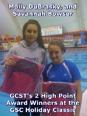 Savannah Bowser, and Molly DuBrasky win High Point Awards as GCST finishes the meet with another big night at Finals...GCST Girls finish the meet 3rd overall in team standings...GCST in 10th place team standings GCST was the 15th largest team in the meet and came away with a 10th place team finish with our very fast 28 swimmers. Great job GCST swimmers!!! 2 High Point Winners 16 Team Records Broken 7 event wins, 6 second place finishes, and 2 third place finishes 56 New and Improved Championship cuts GCST Girls...